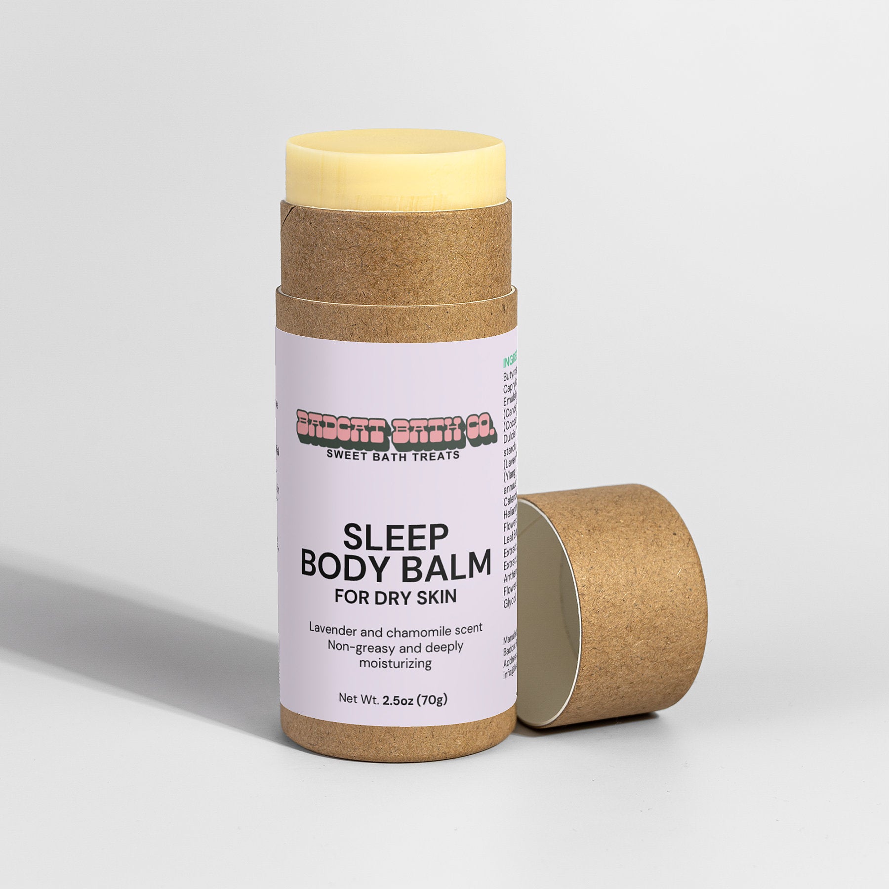 Ingredients: Butyrospermum Parkii (Shea) Butter, Caprylic/capric triglyceride, Emulsifying Wax, Euphorbia cerifera (Candelilla) Wax, Theobroma Cacao (Cocoa) Butter, Prunus Amygdalus Dulcis (Sweet Almond) Oil, Tapioca starch, Lavandula Angustifolia (Lavender) Oil, Cananga Odorata (Ylang Ylang) Flower Oil, Helianthus annuus (Sunflower) Seed Oil, Calendula Officinalis Flower Extract, Helianthus Annuus (Sunflower) Flower Extract, Aloe Barbadensis Leaf Extract, Chondrus Crispus Extract, Althaea Officinalis Root Extract, d-alpha-tocopherol, Anthemis Nobilis (Chamomile) Flower Oil, Phenoxyethanol, Caprylyl Glycol